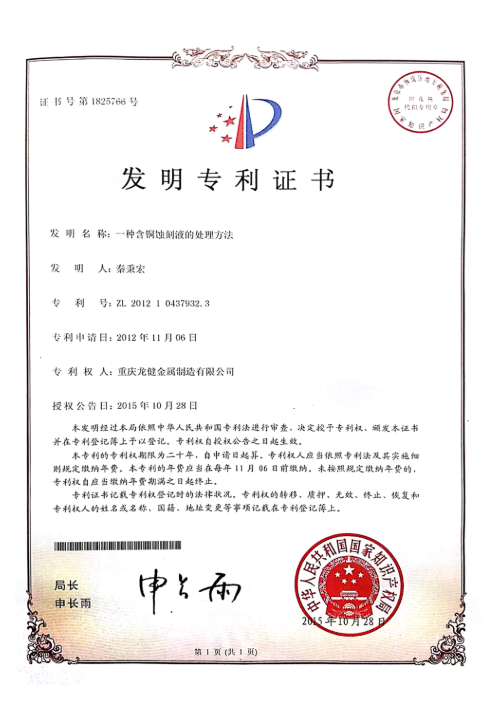 一种含铜蚀刻液的处理方法专利证书