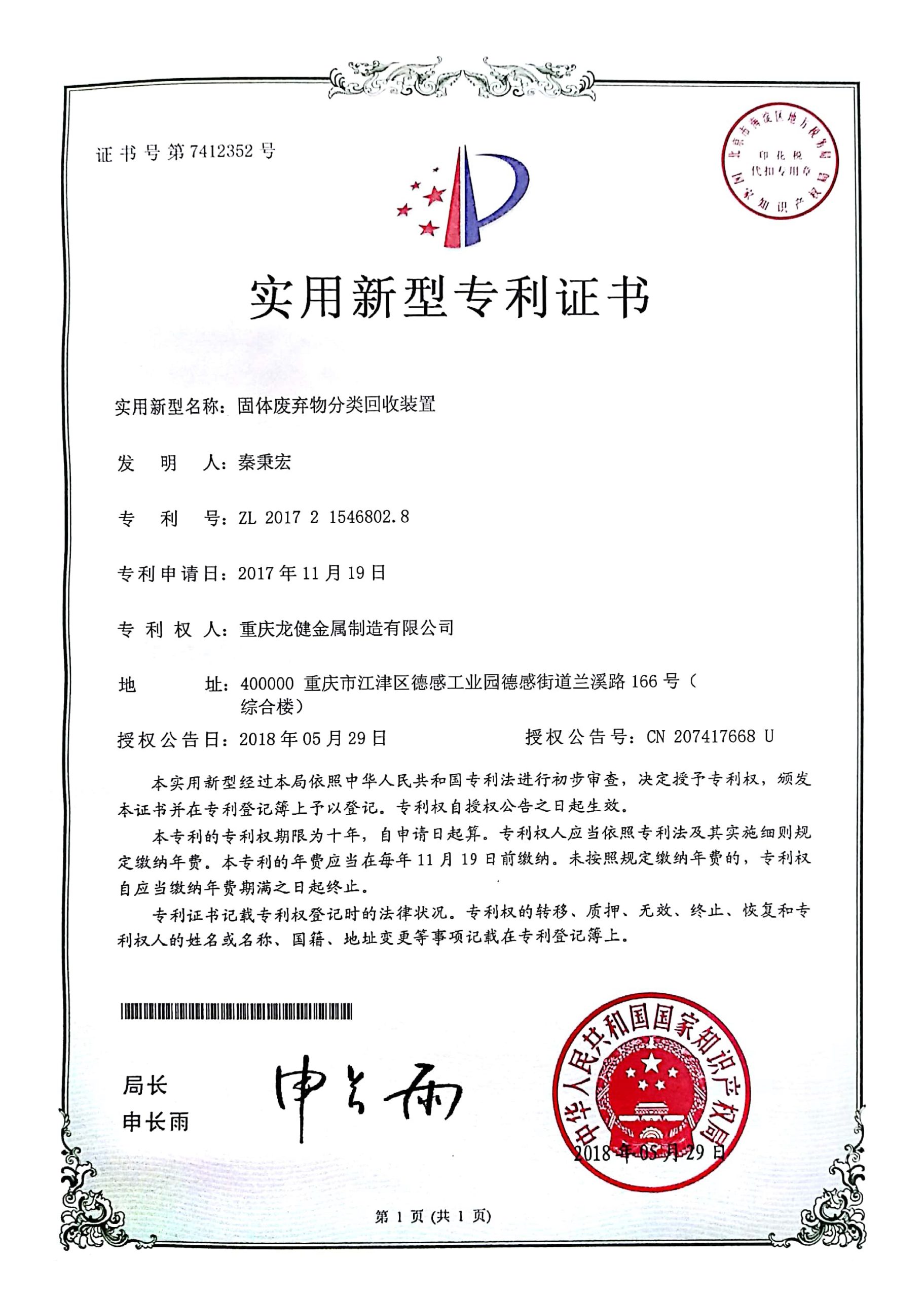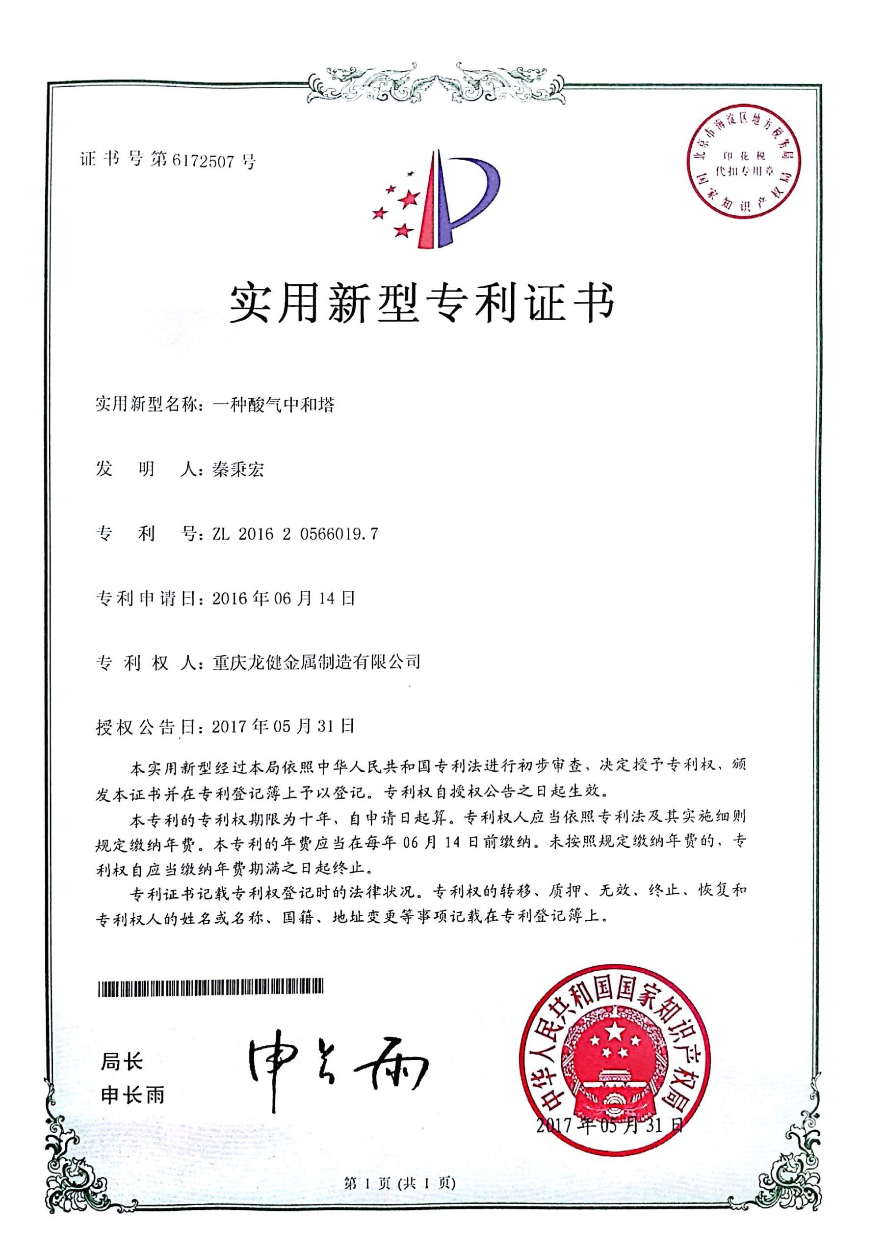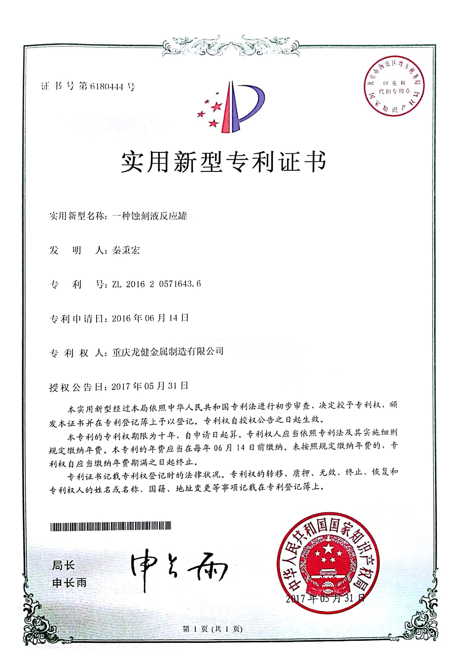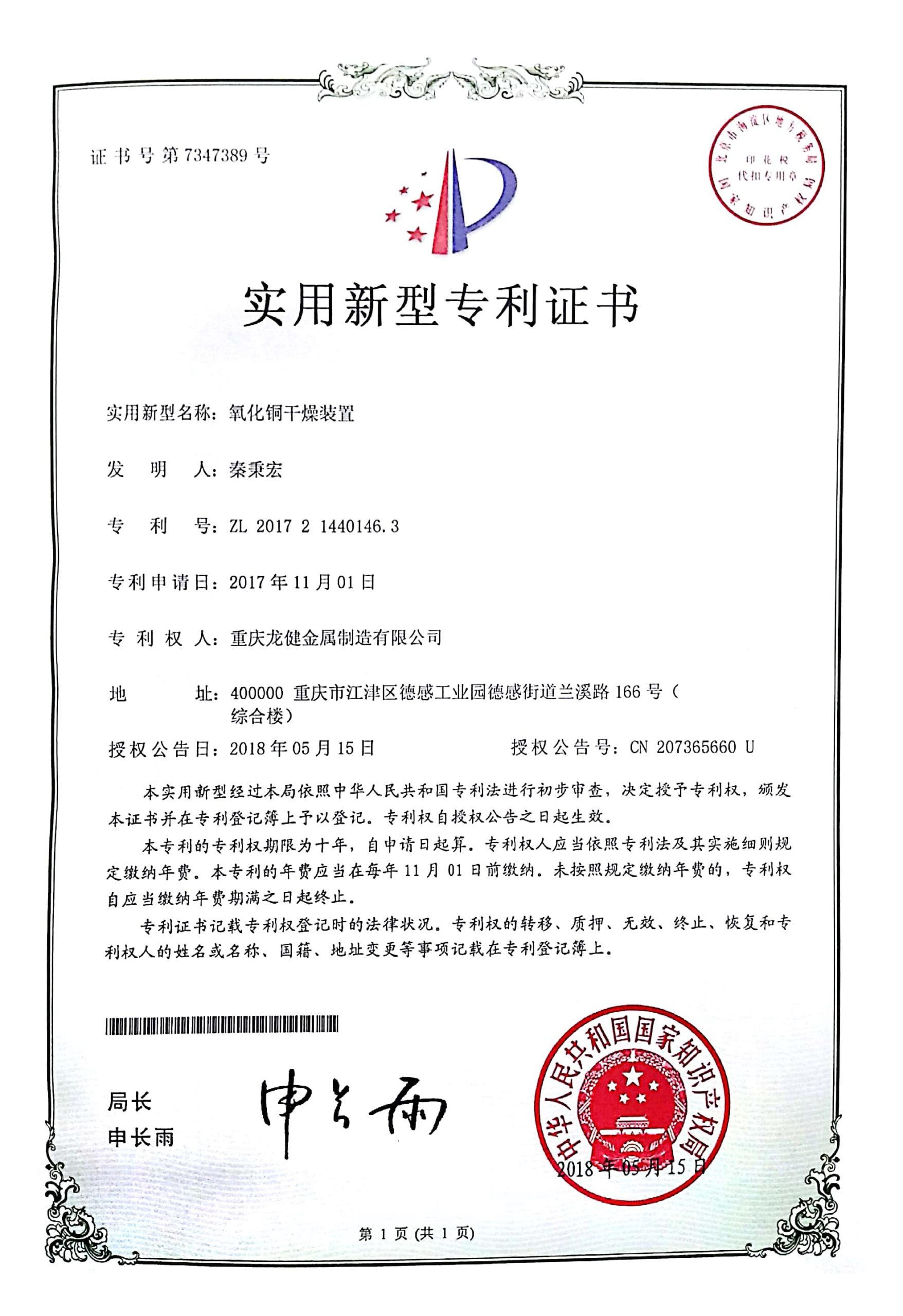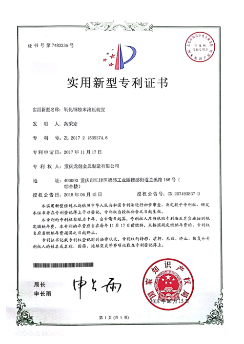氧气铜粉末滚压装置专利证书